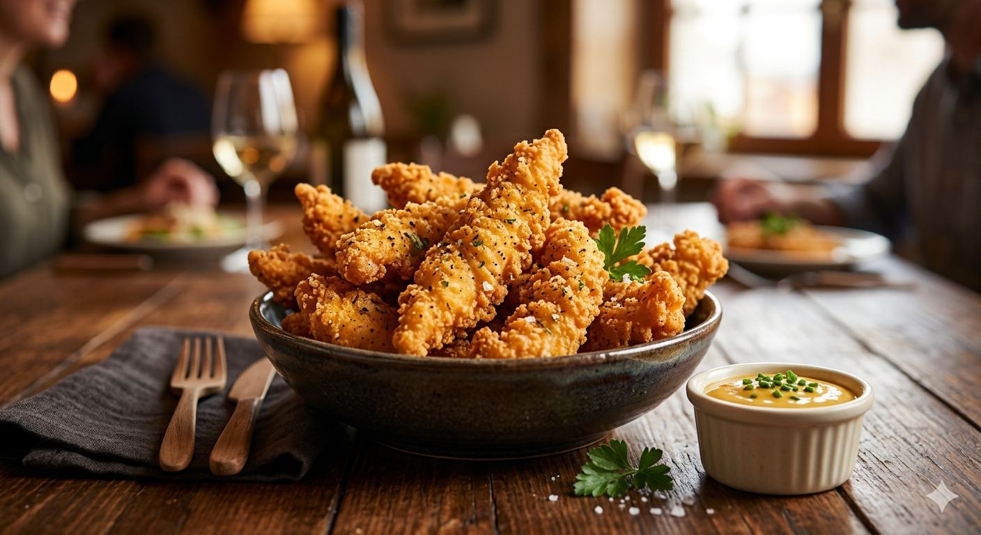 Tirinhas de filé de frango temperadas e empanadas